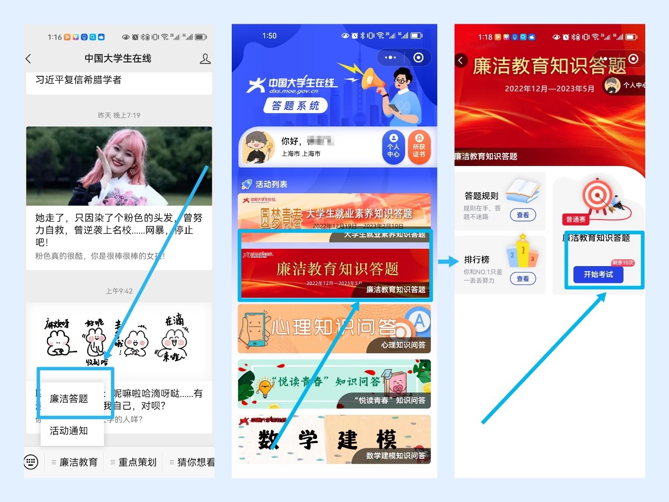 具体请关注“中国大学生在线”微信公众号,点击菜单栏“廉洁教育”参与答题,或登录中国大学生在线活动平台参与答题。