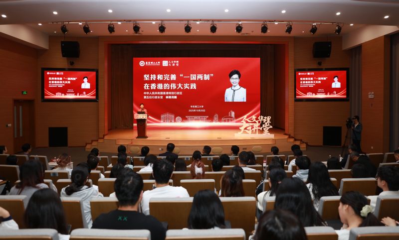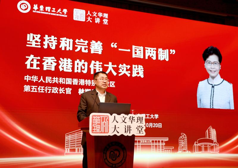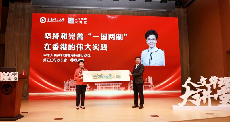 林郑月娥在报告中回顾了香港的发展历史与“一国两制”产生的历史背景,介绍了香港特区的宪制秩序、特区行政长官的宪制地位,并结合自身履职经历分享了担任香港特别行政区行政长官期间,在中央的支持下,依据《中华人民共和国宪法》和《中华人民共和国香港特别行政区基本法》,带领香港战胜诸多挑战的实践。她指出,“一国”是香港发展的根基与本源,“爱国者治港”原则为香港行稳致远奠定坚实基础,全面准确贯彻“一国两制”才能保持香港长期繁荣稳定。当前,“一国两制”实践进入新阶段,香港要继续发挥“背靠祖国、联通世界”的独特优势,为强国建设、民族复兴作出更大贡献。她还介绍了香港打造国际高端人才集聚高地和吸引海内外人才举措等内容,欢迎华理学子赴港深造与发展。