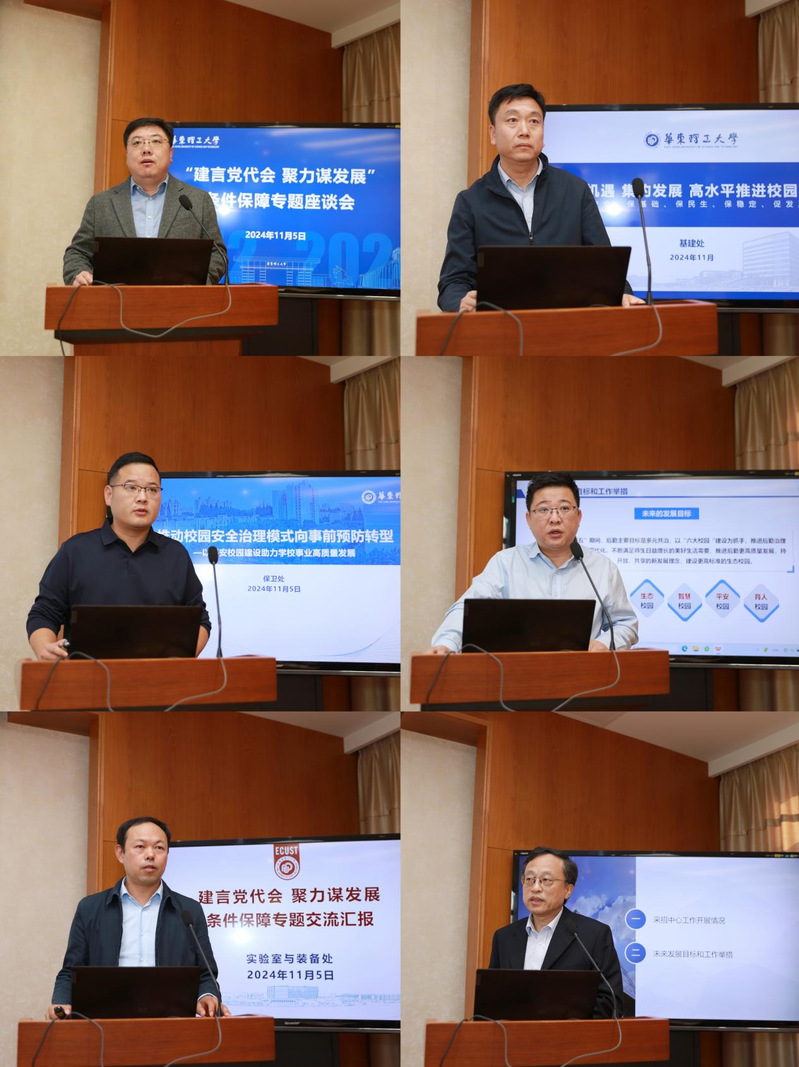 座谈会上,财务处处长李德强汇报了学校财务总体情况、当前面临的机遇和挑战以及未来工作举措。基建处处长龚向明、保卫处副处长(主持工作)焦建辉、后勤保障处处长陈坚、实验室与装备处处长付尧、采购与招投标管理中心主任陈康分别汇报了学校基础设施建设、校园安全管理、后勤服务保障、实验室用房管理、采购招标等方面的情况,并提出了未来工作方向和举措。与会代表围绕校园信息化建设、实验楼宇搬迁等方面进行了深入交流。